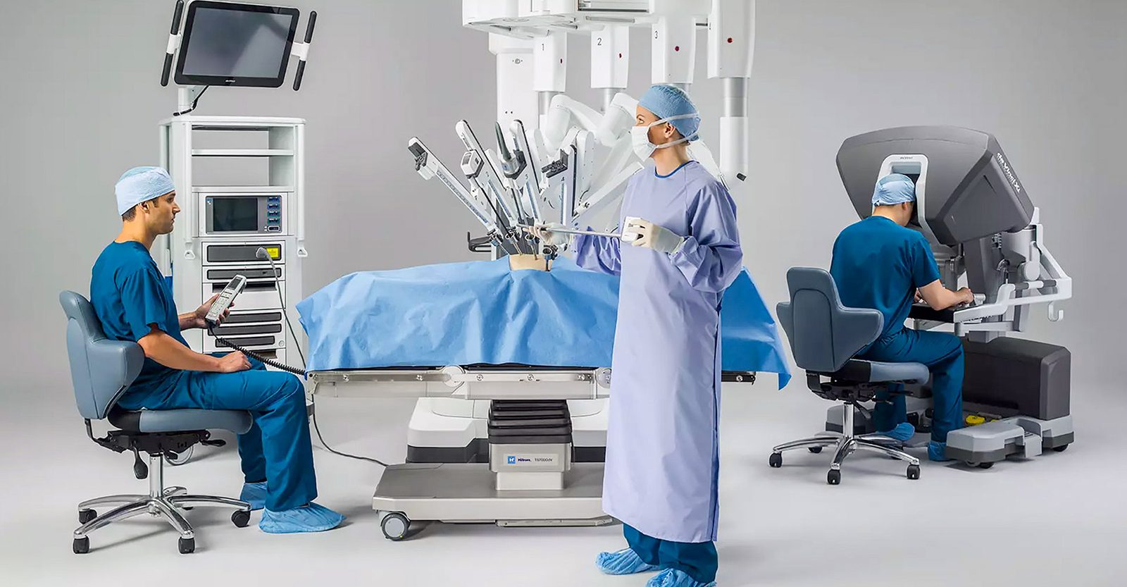 Systém pracuje se čtyřmi rameny: tři drží operační nástroje a čtvrté kameru. Chirurg nesedí přímo u pacienta, ale u ovládací konzole. Přes hledí sleduje obraz z kamery a pedály přepíná nástroje. V praxi tak může plynule pracovat s několika nástroji, jako by měl „další ruku“ navíc.